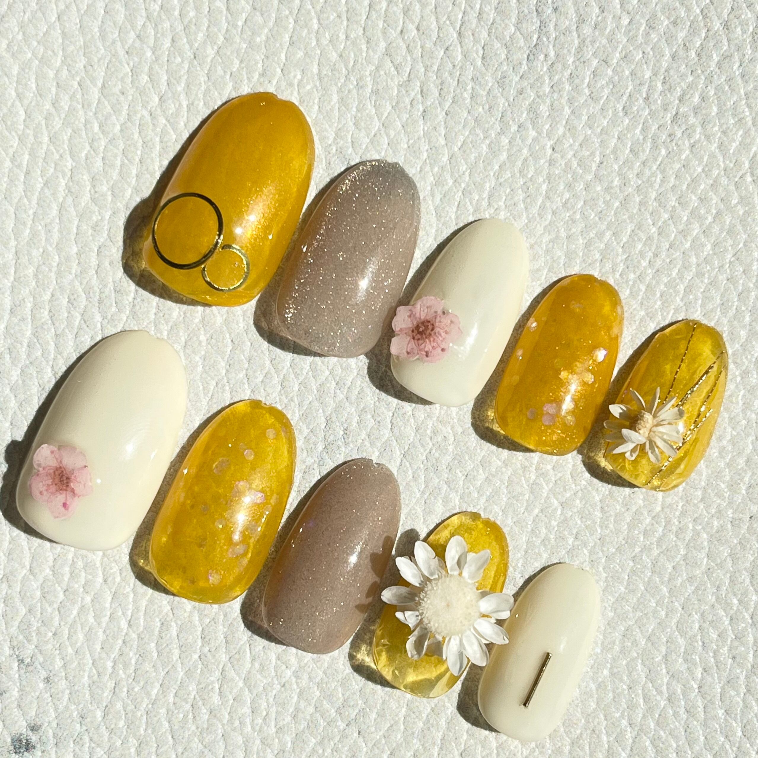 明るいイエローとクリーミーなホワイトの組み合わせに、リアルな押し花や繊細なメタルパーツをあしらった、ナチュラル&ガーリーなネイルチップセット。透明感のあるイエローカラーはまるでハチミツのようなツヤ感で、手元をパッと華やかにしてくれます。