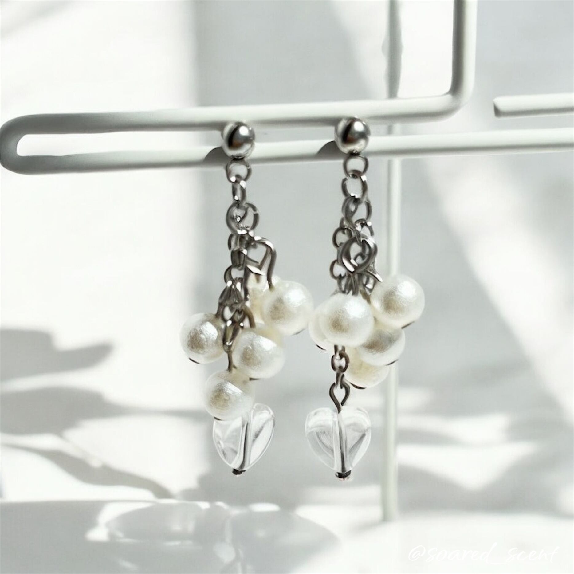 このコットンパールとハートのピアスは、優雅さと遊び心を兼ね備えたデザインです。特徴的な質感のあるホワイトパールが5つ並び、華やかさを演出します。アシンメトリーなバランスと、下部に揺れるクリスタルハートが独特の印象を与え、どんなシーンでも目を引くアクセサリーです。