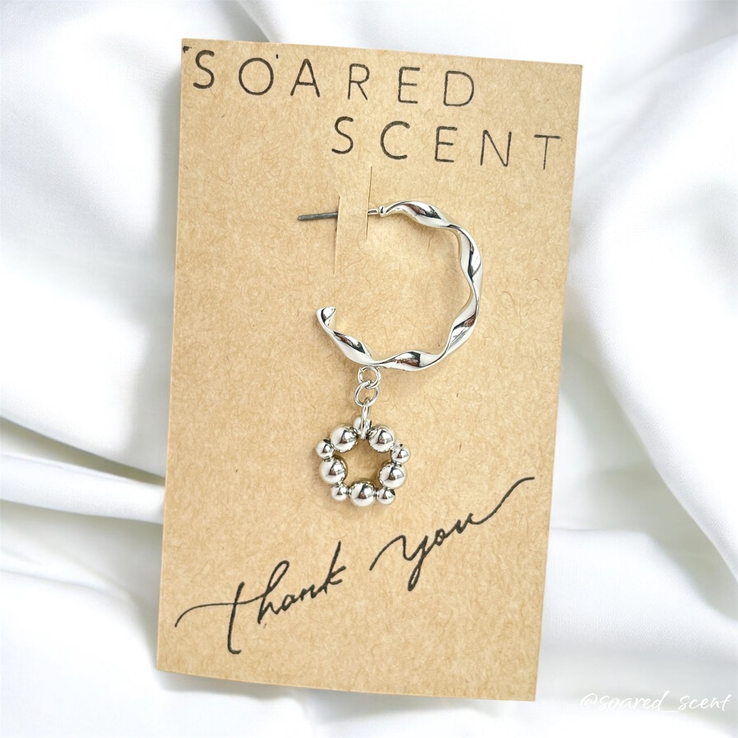 ひねりのフープがアクセントになり、単調にならない印象を与え、動くたびに揺れるチャームがさりげなく輝きをプラスします。