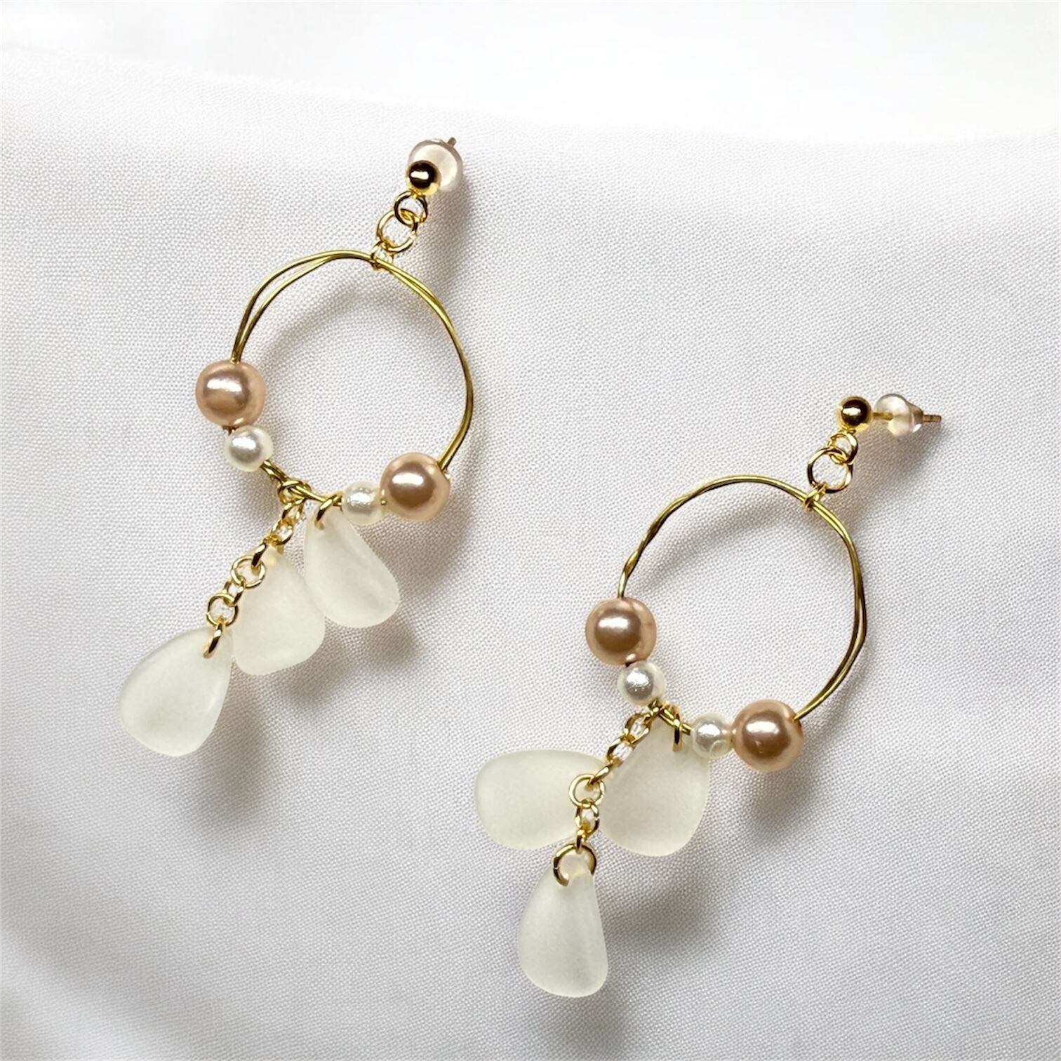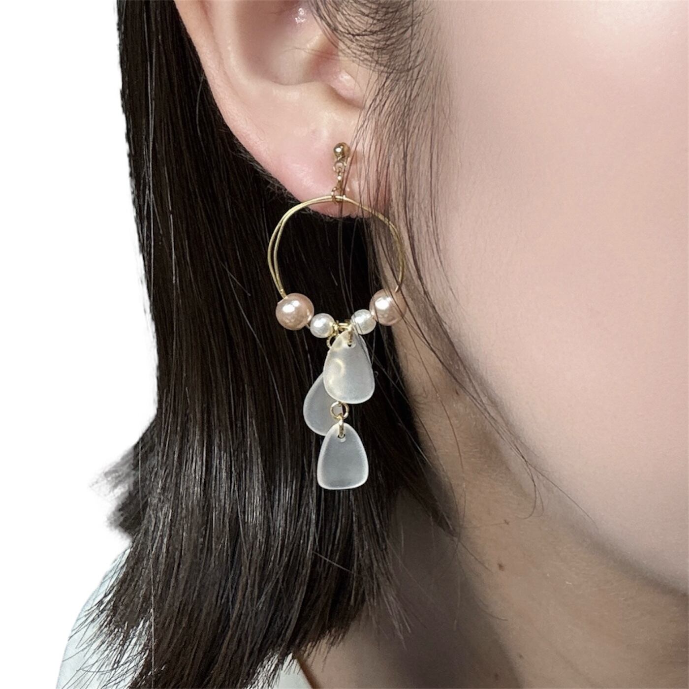 下には花びらをイメージしたパーツを重ね、風に舞うような軽やかさと透明感を表現しました。ひとつひとつ形の異なる花びらが、光を通すたびに優しく表情を変え、見る角度によって印象がふんわりと移ろいます。