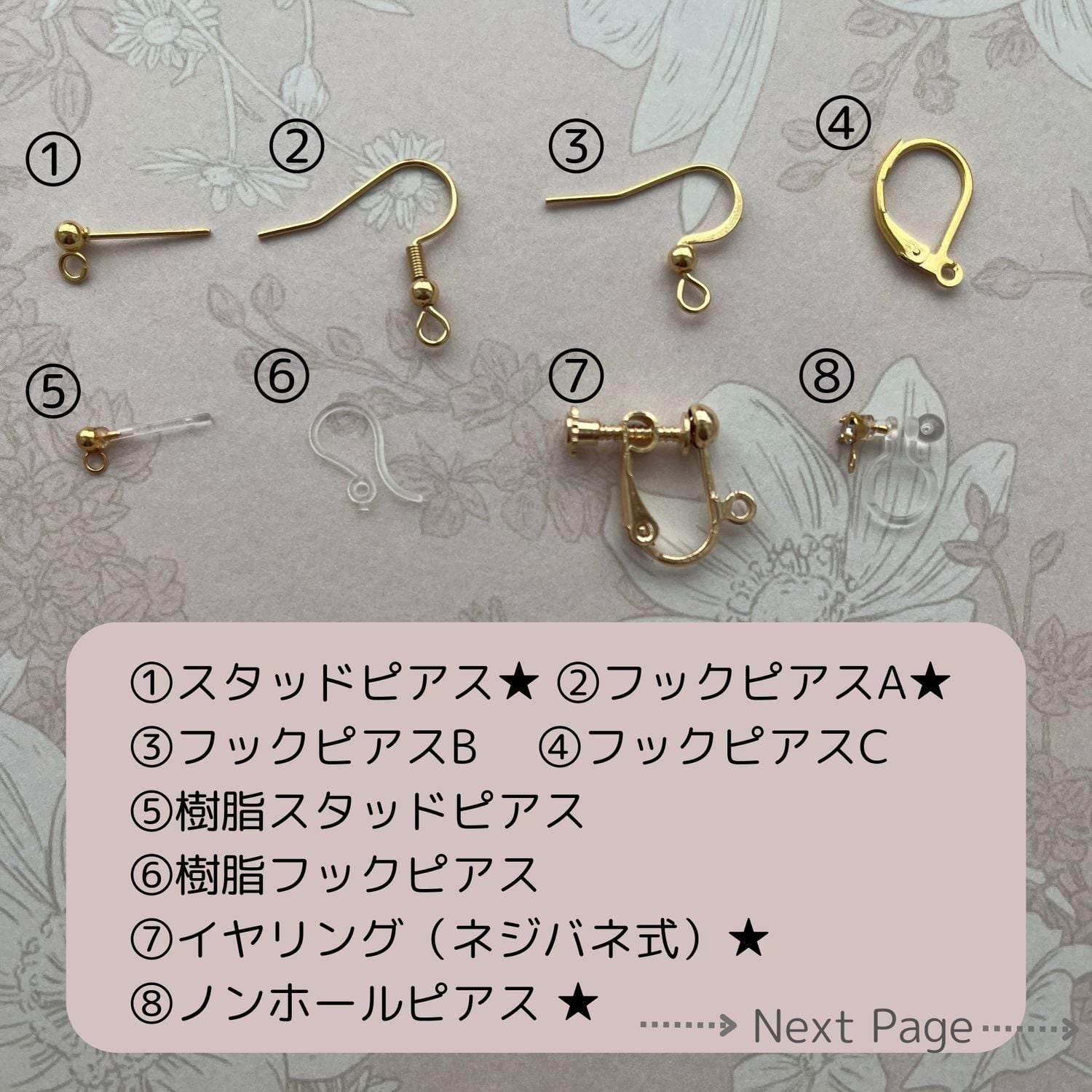 素材:ワイヤー、パール、プラスチック、サージカルステンレス(金具)