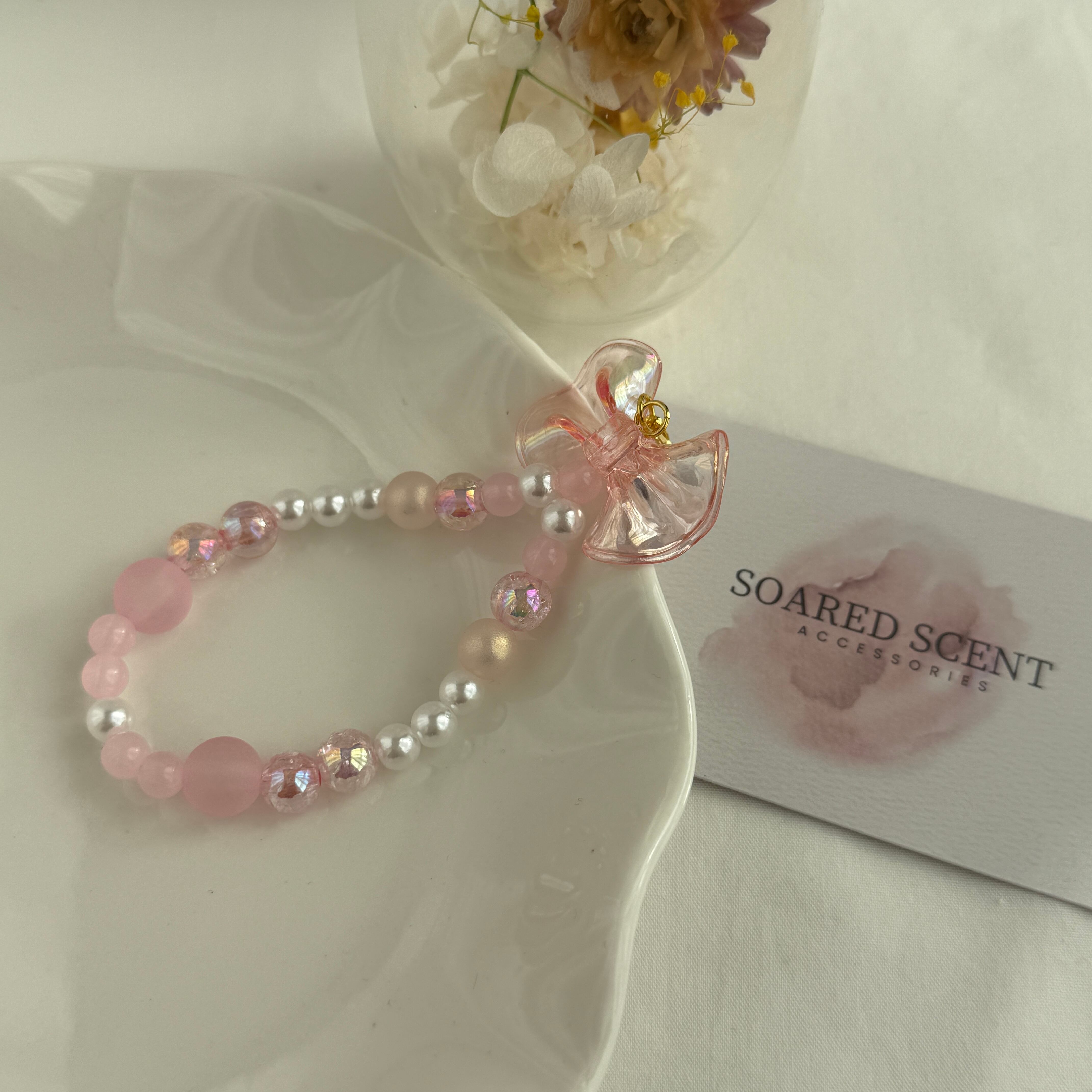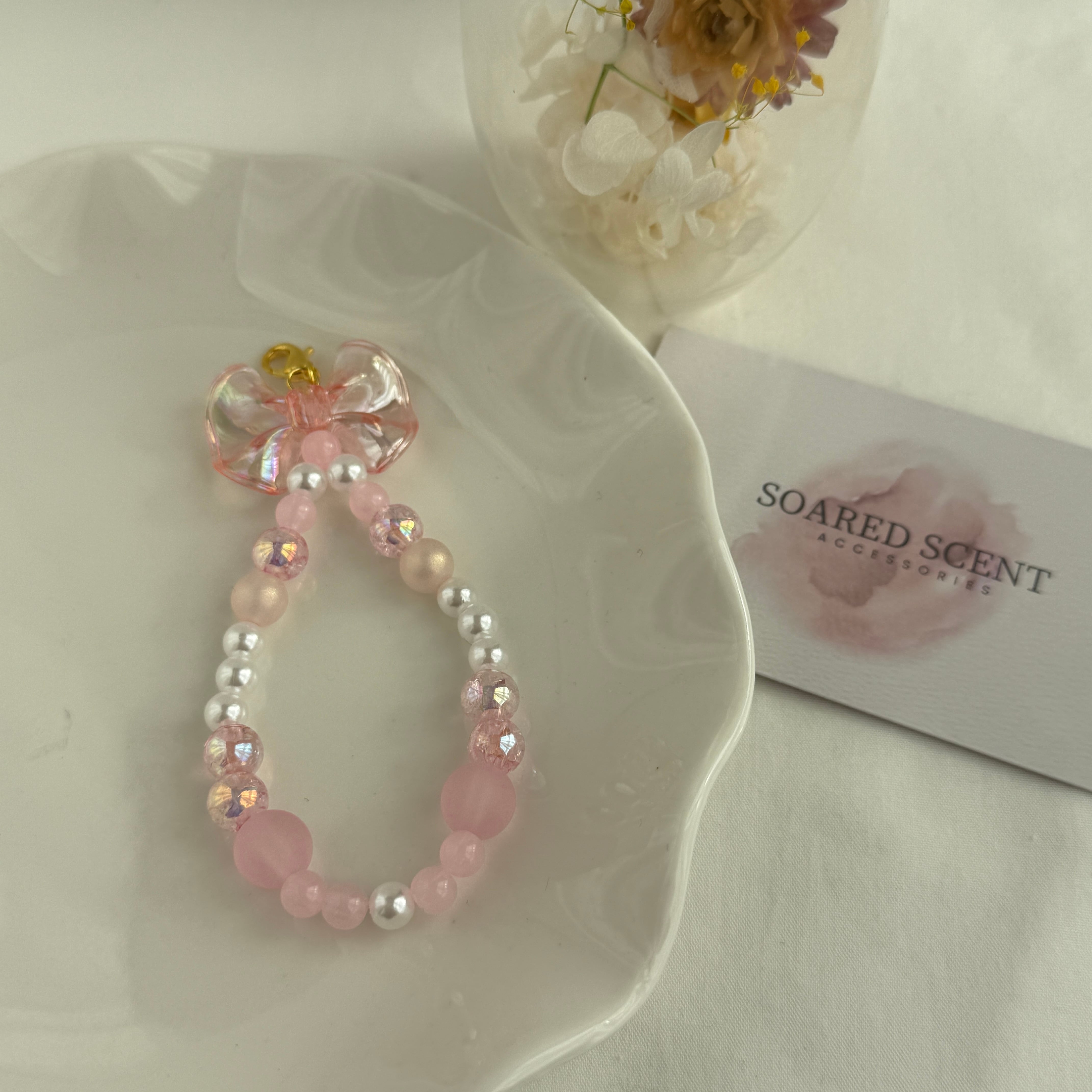 淡いカラーのリボンチャームと、さまざまな質感のビーズを組み合わせたハンドメイドのビーズストラップです。