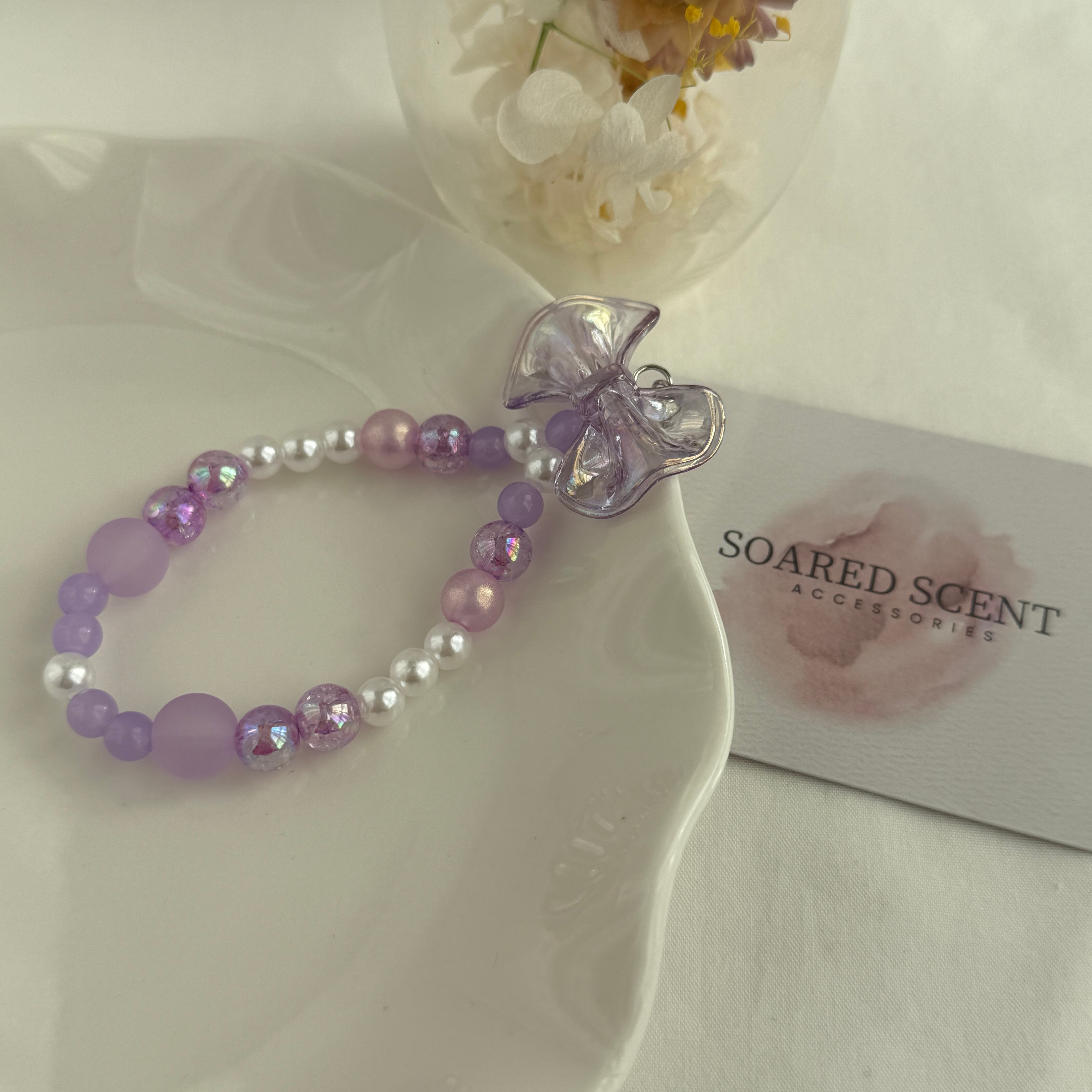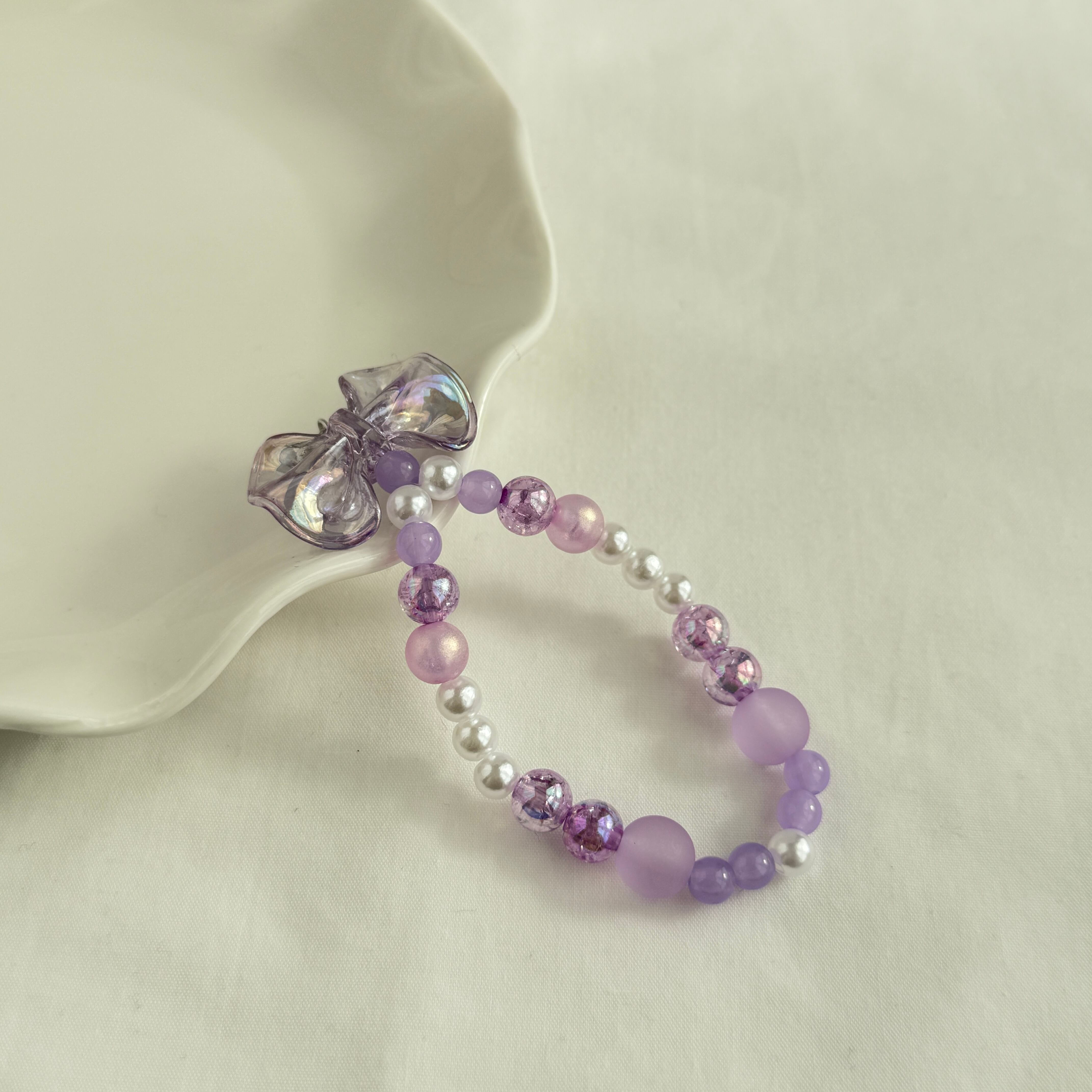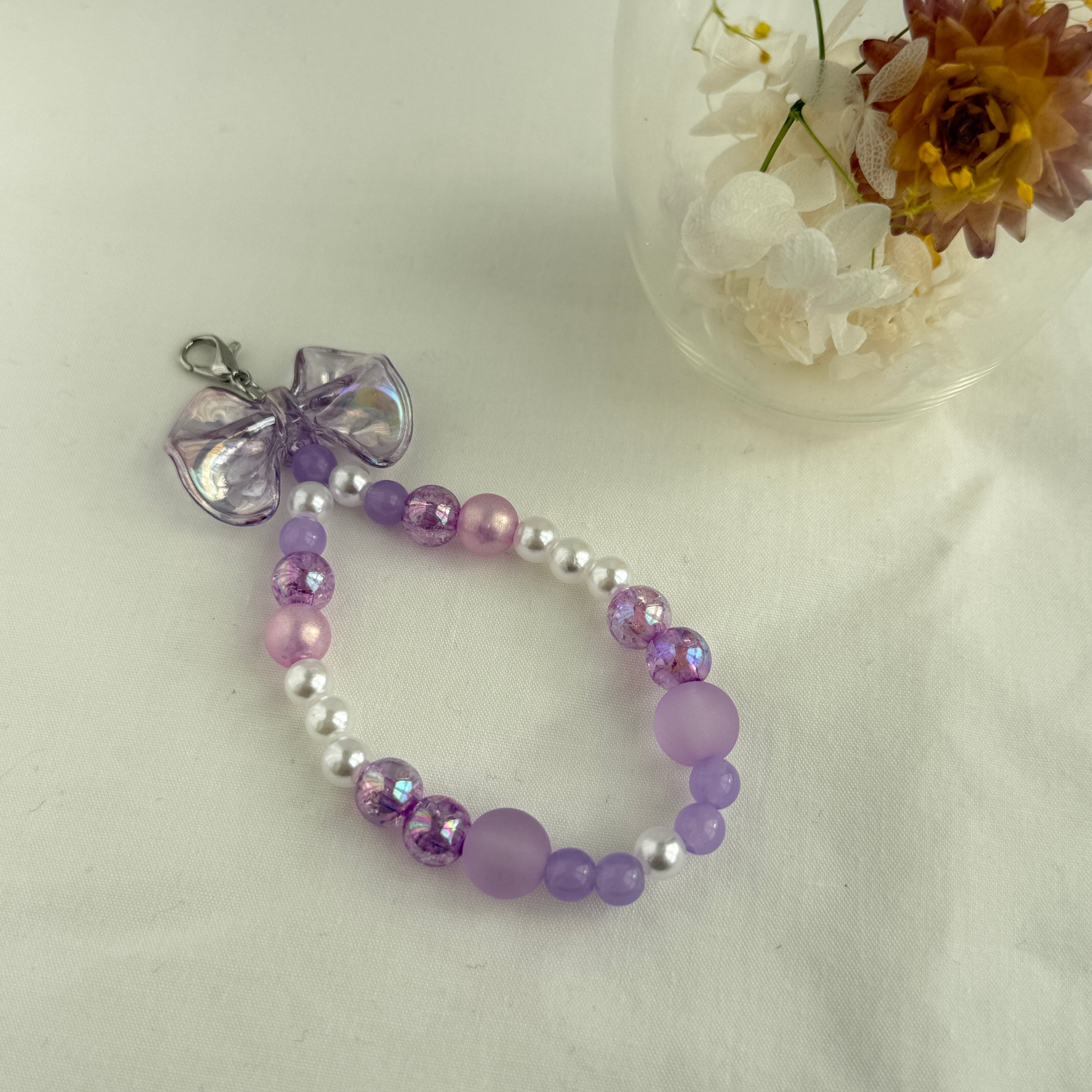 淡いカラーのリボンチャームと、さまざまな質感のビーズを組み合わせたハンドメイドのビーズストラップです。